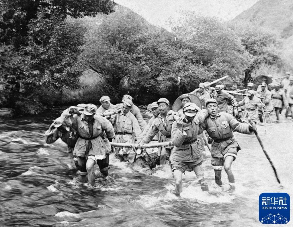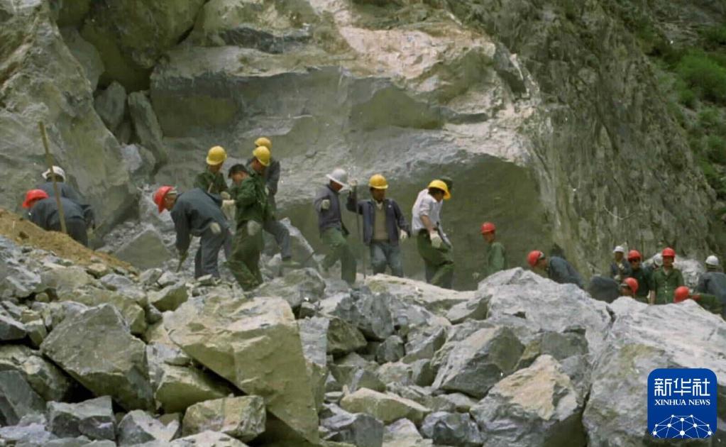 1950年,築路大軍(jun) 挺進西藏途中,官兵們(men) 在冰冷刺骨的河水中抬運石料。新華社發