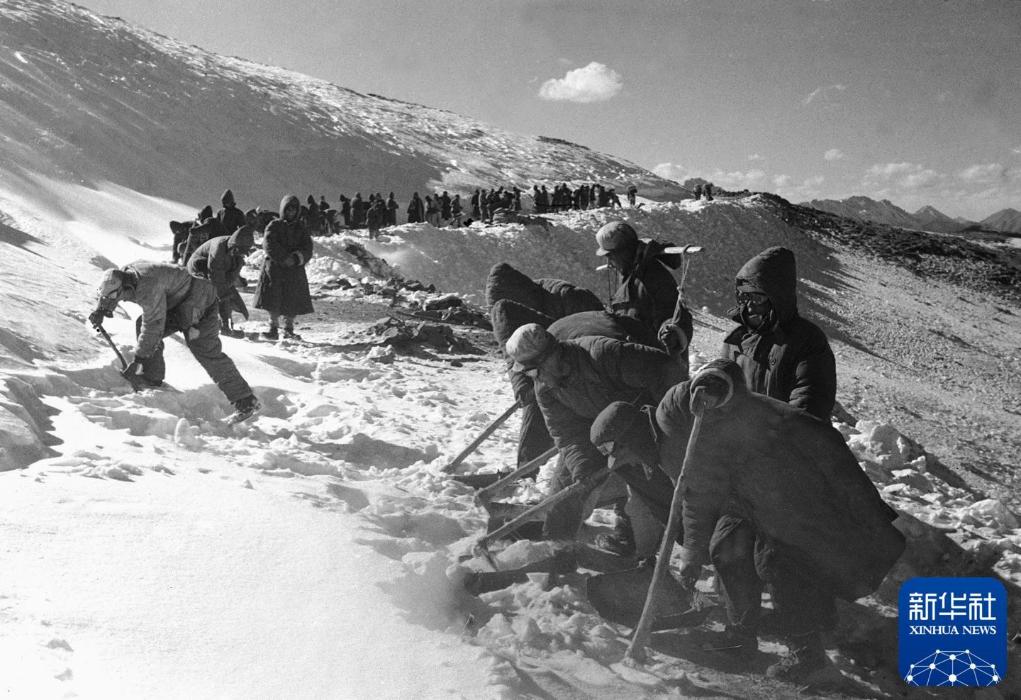 1952年,築路民工在甲皮拉山頂鏟除冰雪,讓汽車通過。新華社記者 趙慎應 攝