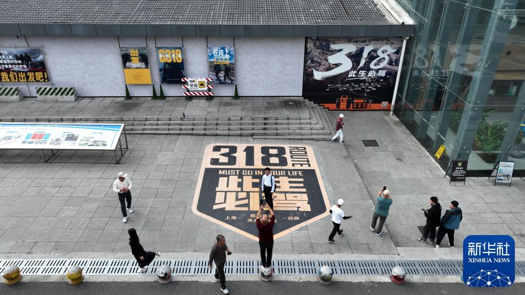 2024年10月27日,遊客在雅康高速天全服務區地標圖案前拍照(無人機照片)。新華社記者 胥冰潔 攝