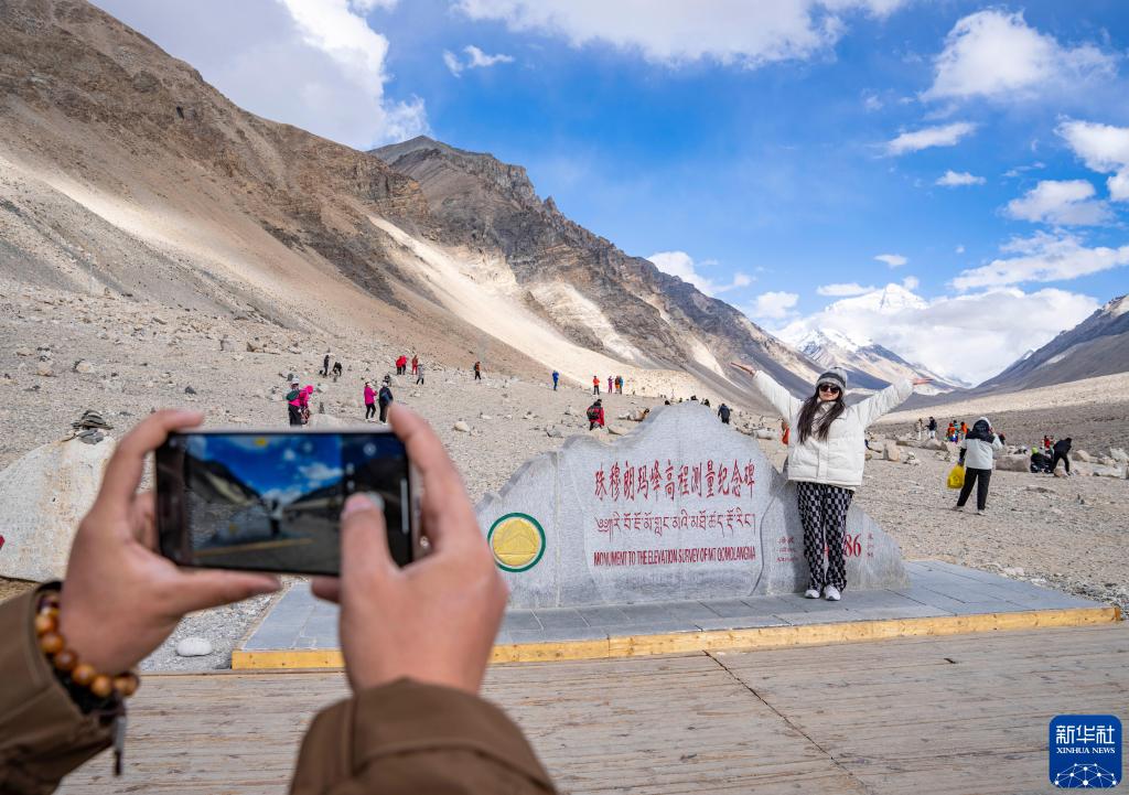 2024年5月24日,遊客在珠穆朗瑪峰高程測量紀念碑前拍照留念。新華社記者 孫非 攝