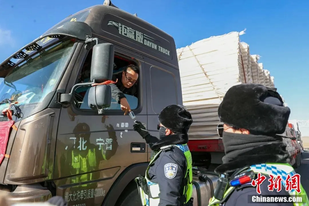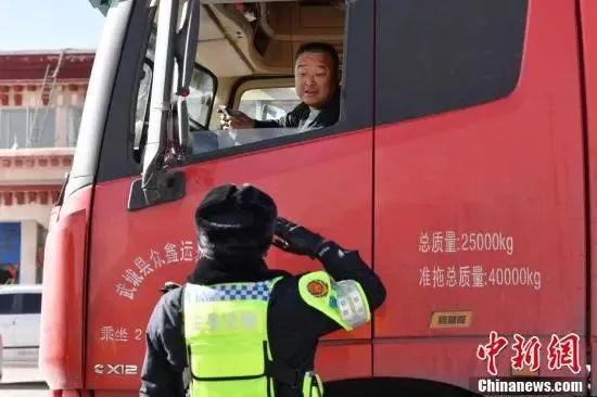 圖為(wei) 交警對貨車檢查後敬禮放行。中新社記者 貢嘎來鬆 攝