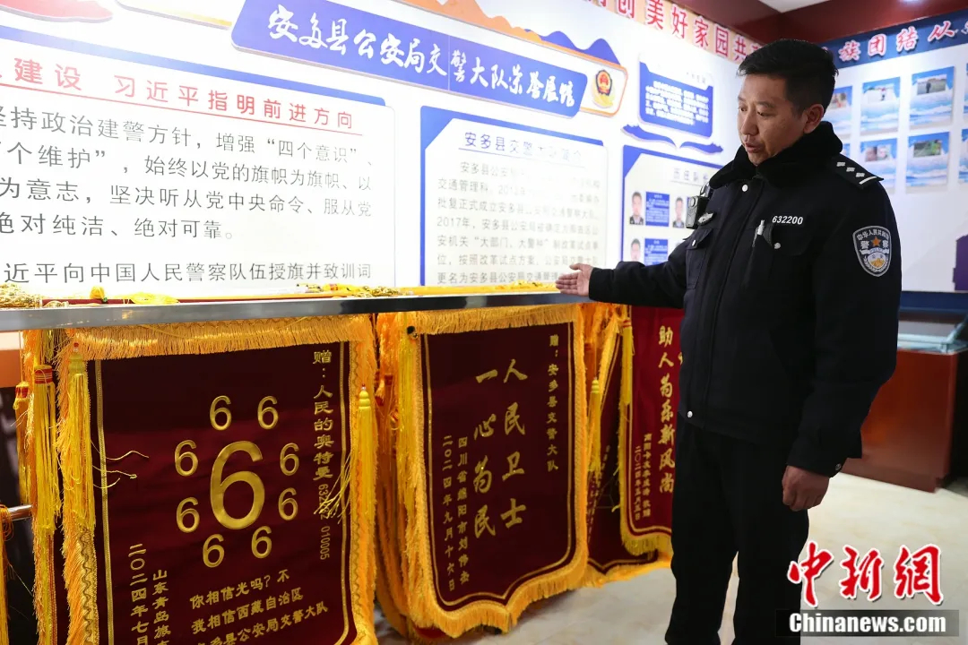 圖為(wei) 安多縣交警向記者展示多年來獲贈的部分錦旗。中新社記者 薛蒂 攝