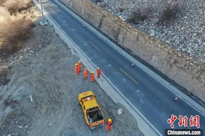 圖為(wei) 道班工人在公路上巡護。(無人機照片)中新社記者 貢嘎來鬆 攝
