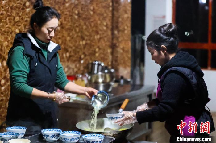 12月20日,西藏芒康,果拉卓瑪(左)在為(wei) 食客盛加加麵。中新社記者 薛蒂 攝