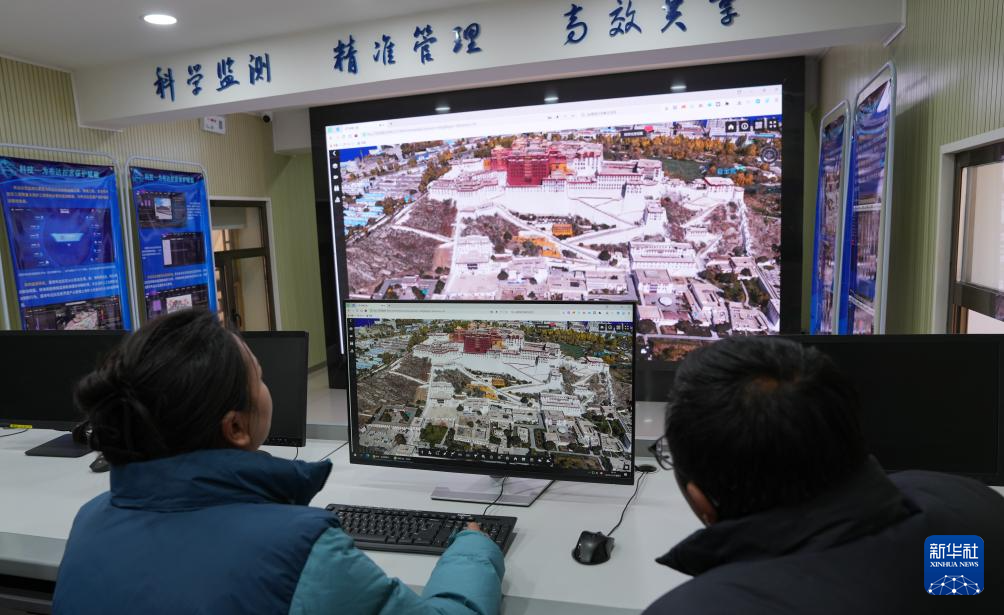 12月4日,布達拉宮監測中心的工作人員在查看無人機拍攝的圖像。新華社記者 晉美多吉 攝