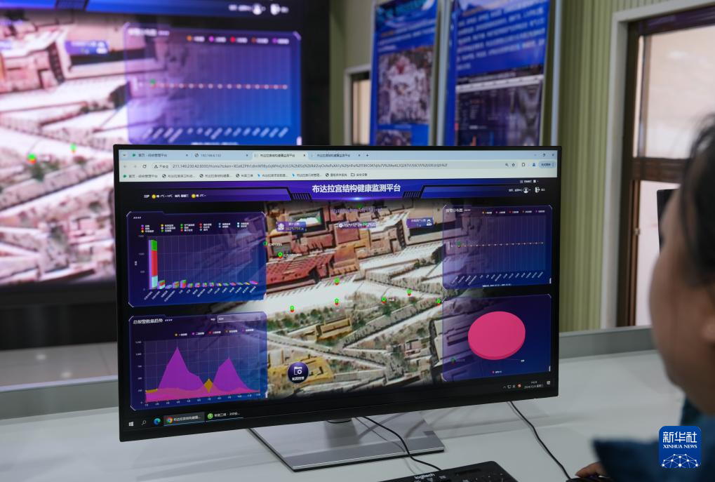 12月4日,布達拉宮監測中心的工作人員在查看布達拉宮結構健康監測平台。新華社記者 晉美多吉 攝