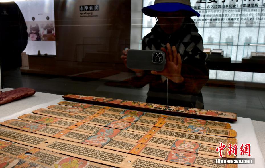 以“見證與(yu) 守望——鑄牢中華民族共同體(ti) 意識主題展”為(wei) 主題的展覽近日亮相西藏自治區拉薩市布達拉宮雪城珍寶館。本次主題展精選100餘(yu) 件文物珍品,展覽通過文物、古籍及布達拉宮的傳(chuan) 承與(yu) 發展,講述各民族交往交流交融的故事。圖為(wei) 1月2日,觀眾(zhong) 拍攝展覽中的13世紀《般若八千頌》貝葉經寫(xie) 本。中新社記者 李林 攝