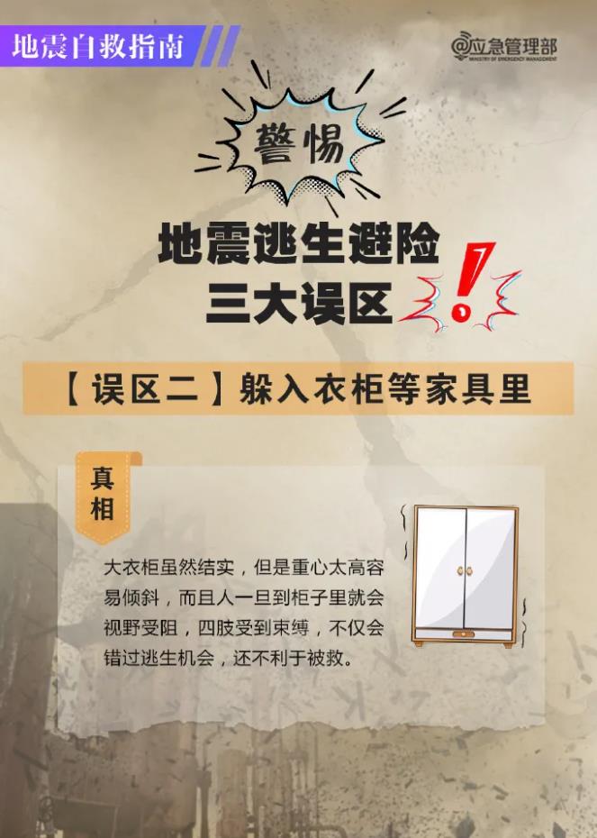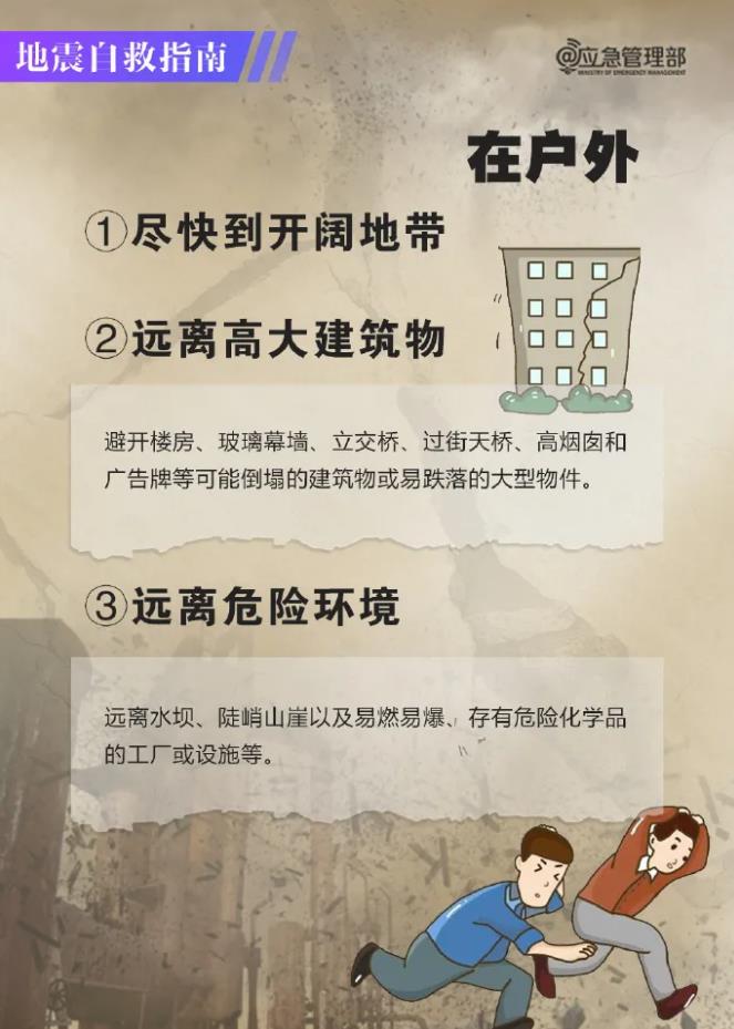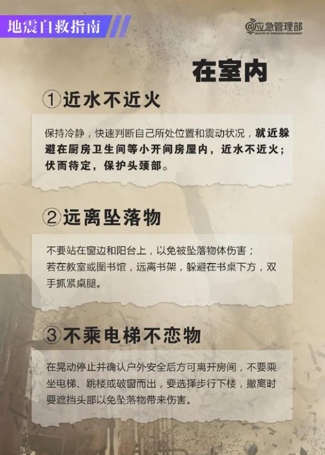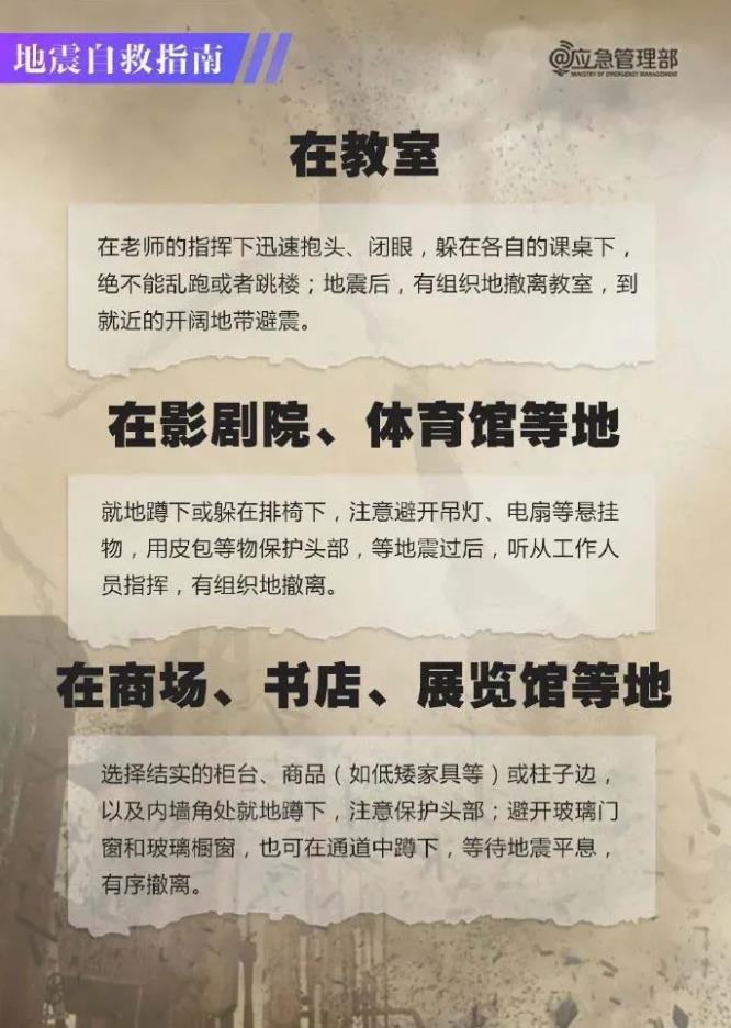 對於(yu) 抗震能力弱的建築物,在單層房屋或樓房一二層的人員,要迅速撤離到室外的安全區域,在樓房三層及以上的人員,就近躲避。對於(yu) 抗震能力強的建築物,可以就近躲避。
