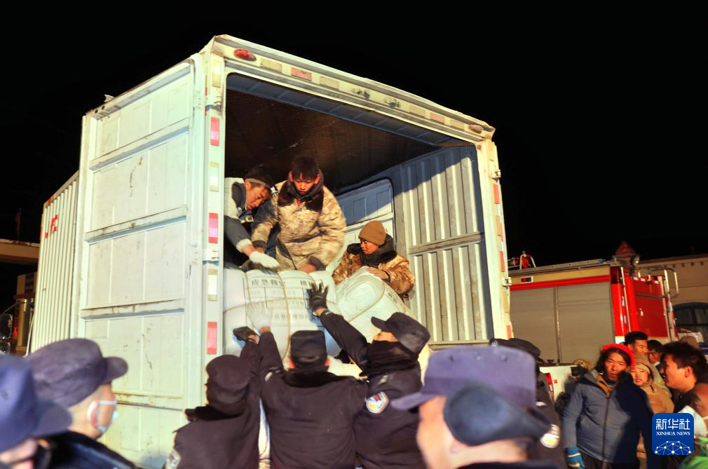 1月7日,救援人員在定日縣措果鄉(xiang) 裝運救災物資。新華社記者 薑帆 攝