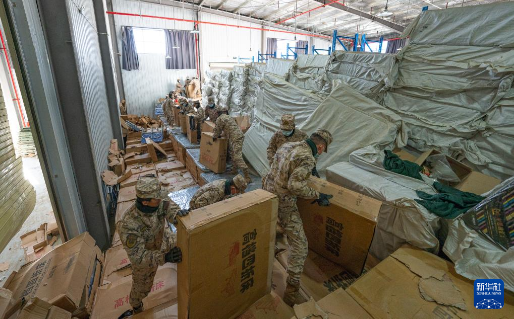 1月8日,在日喀則市經開區物資儲(chu) 備倉(cang) 庫,武警官兵在搬運抗震救災物資。