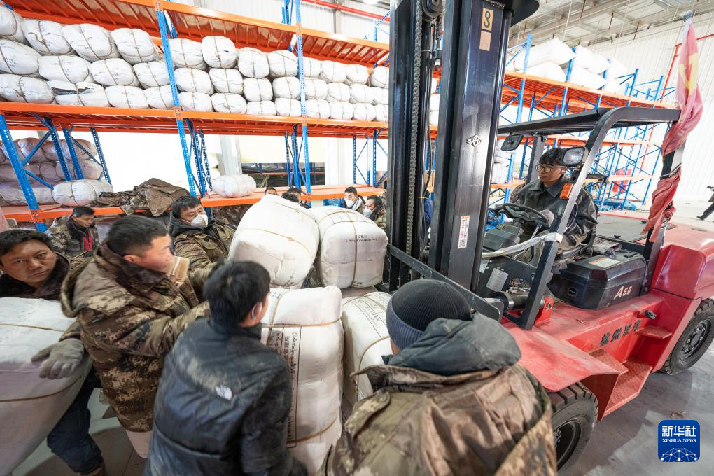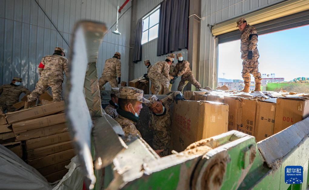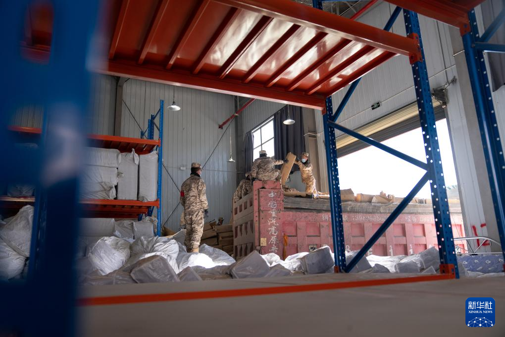 1月8日,在日喀則市經開區物資儲(chu) 備倉(cang) 庫,武警官兵在搬運抗震救災物資。新華社記者 丁增尼達 攝