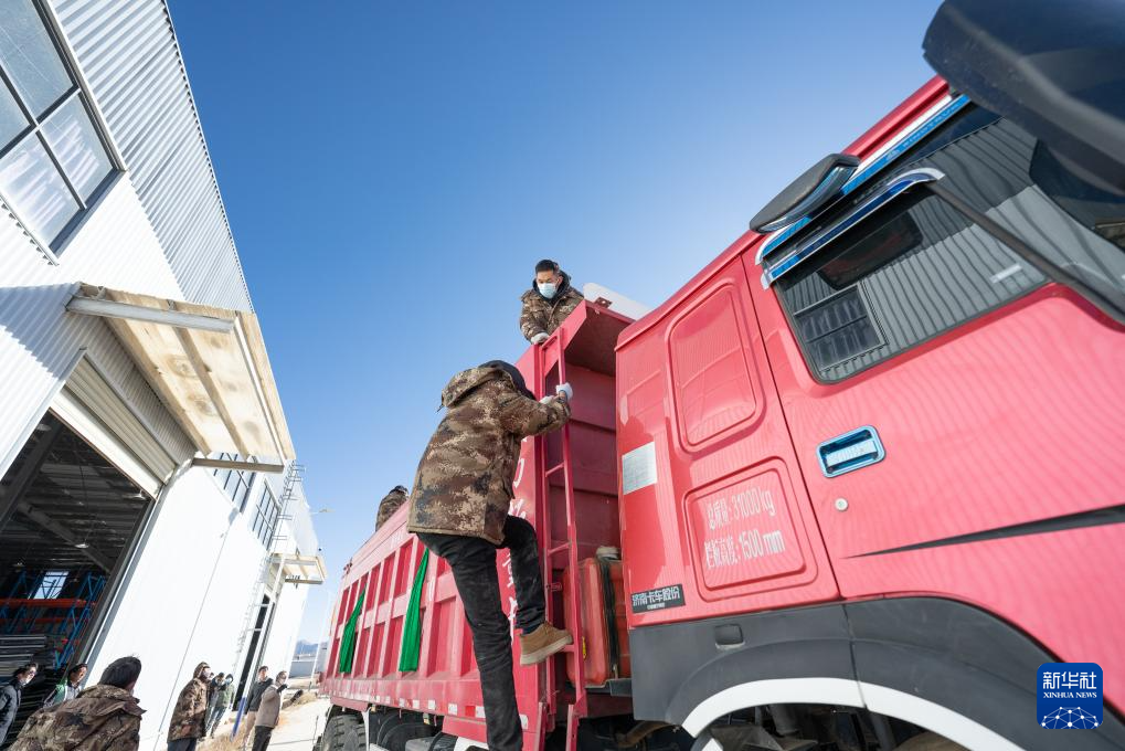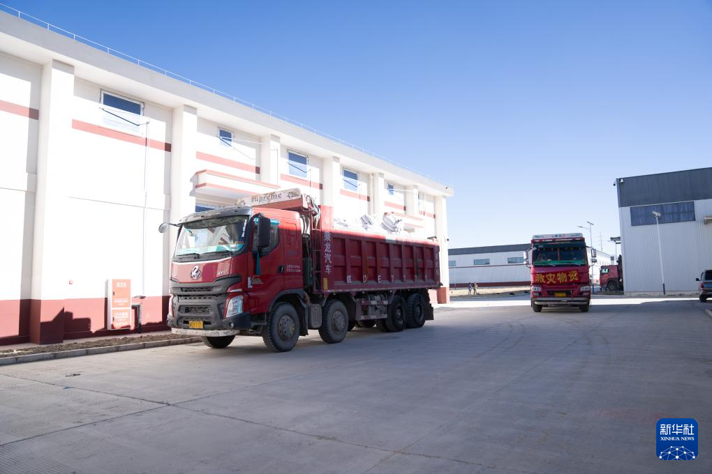 1月8日,在日喀則市經開區物資儲(chu) 備倉(cang) 庫,裝好抗震救災物資的車輛駛出園區。新華社記者 丁增尼達 攝