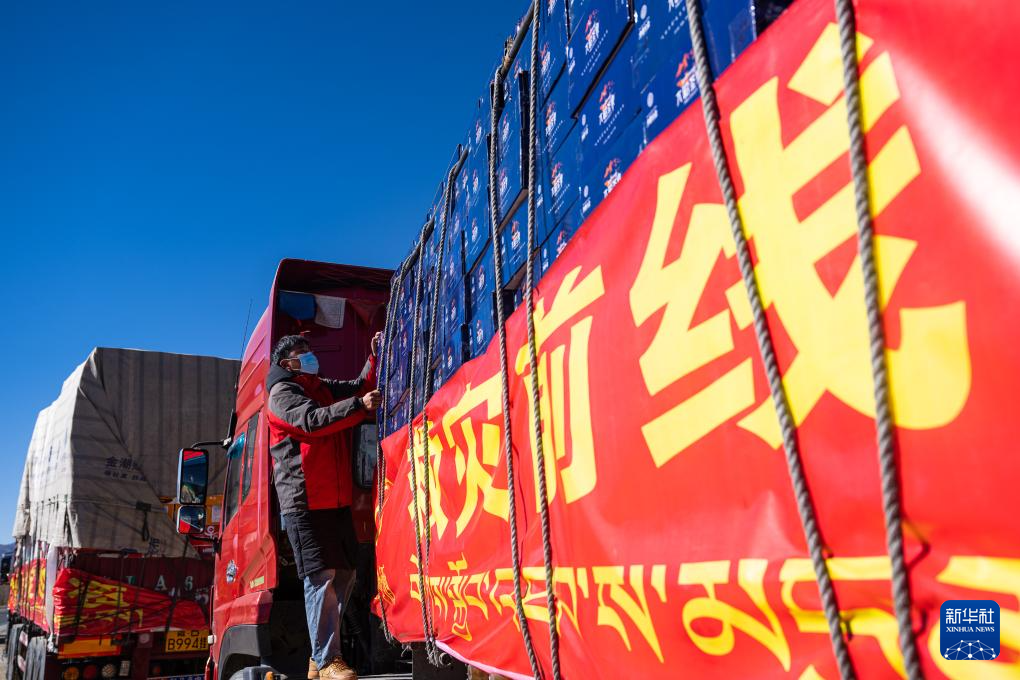 1月8日,在日喀則市境內(nei) 的318國道旁,當地企業(ye) 工作人員在用繩子固定抗震救災物資。新華社記者 丁增尼達 攝