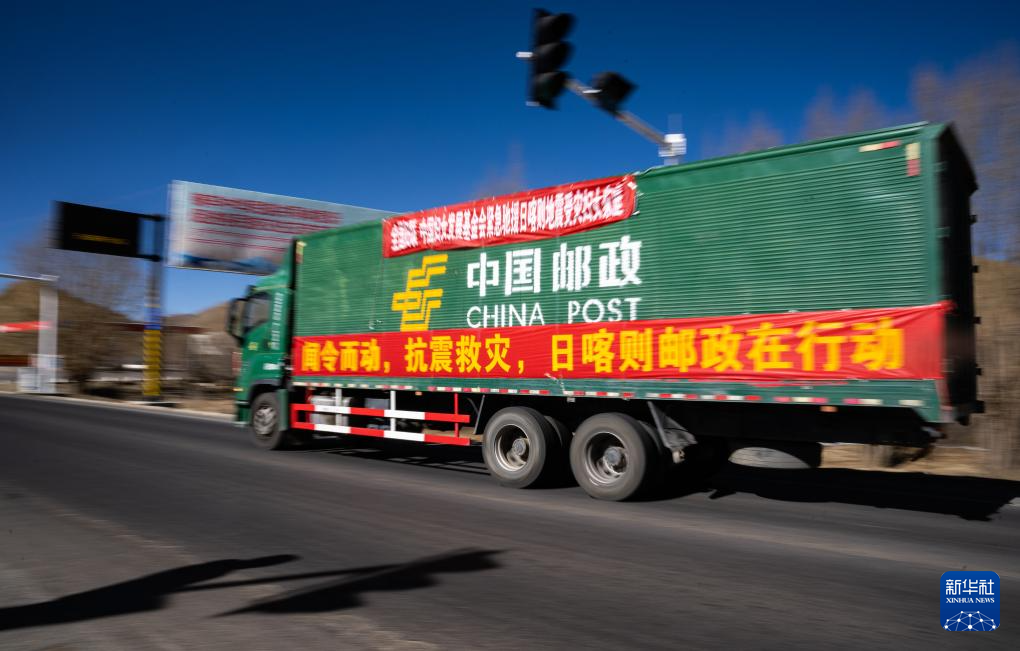 1月8日,在日喀則市境內(nei) 的318國道,中國郵政的抗震救災運輸車輛向災區方向駛去。新華社記者 丁增尼達 攝