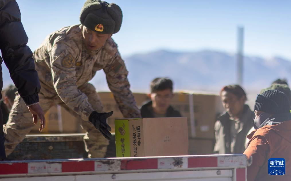 1月8日,解放軍(jun) 戰士在尼轄鄉(xiang) 雪龍村幫助受災群眾(zhong) 搬運生活物資。新華社記者 薑帆 攝