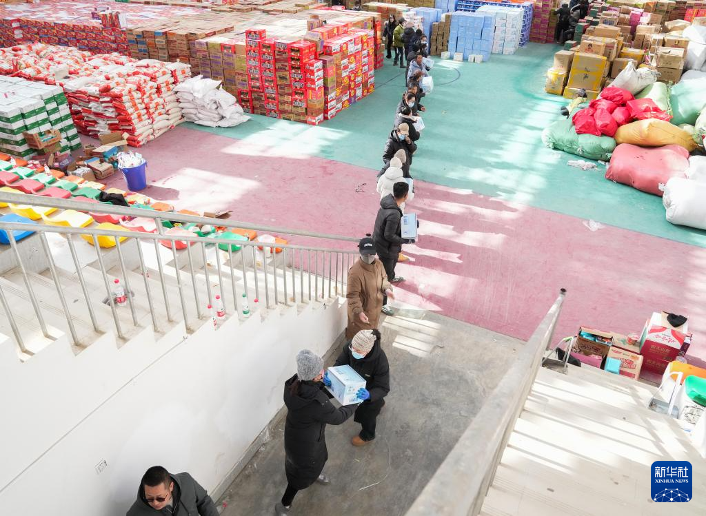 1月8日,在定日縣人民政府的救援物資點,幹部群眾(zhong) 接力傳(chuan) 遞救援物資。新華社記者 丁汀 攝