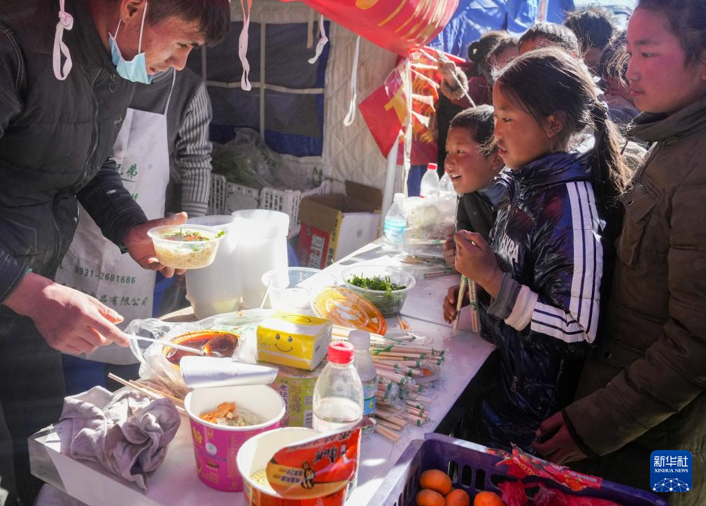 1月8日,在日喀則市定日縣長所鄉(xiang) 森嘎村的臨(lin) 時安置點,馬仁(左一)為(wei) 受災小朋友免費供應麵食。據馬仁介紹,他來自定日縣,和朋友一起來臨(lin) 時安置點為(wei) 災區群眾(zhong) 免費提供麵食。據悉,從(cong) 7日下午兩(liang) 點開始,他們(men) 已送出近1200份麵食。新華社記者 丁汀 攝