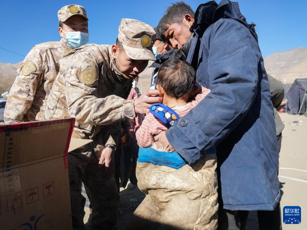1月8日,在長所鄉(xiang) 森嘎村臨(lin) 時安置點,西藏軍(jun) 區總醫院醫療隊隊員為(wei) 小朋友治療。新華社記者 丁汀 攝