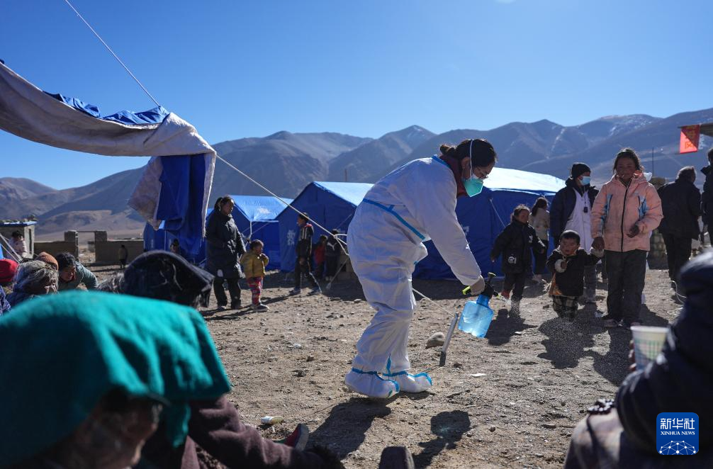 1月8日,在定日縣措果鄉(xiang) 野江村安置點,醫護人員進行消殺。新華社記者 晉美多吉 攝