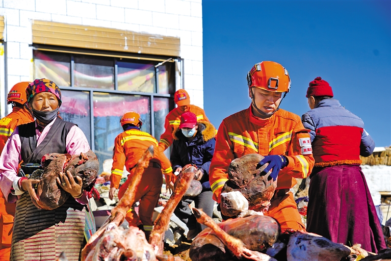 1月8日,在定日縣措果鄉(xiang) 美朵村,林芝市森林消防支隊消防員在協助受災群眾(zhong) 轉移冬季存放的羊肉。記者 索朗群培 攝