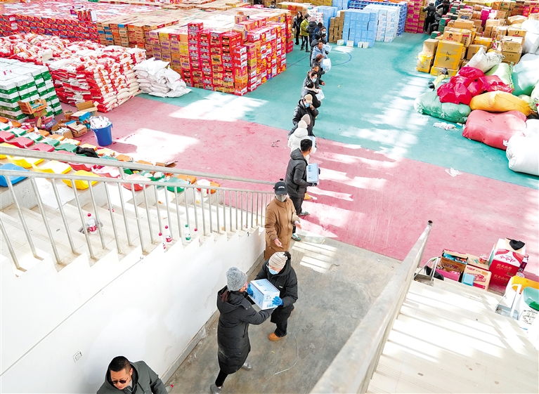 圖為(wei) 1月8日,在定日縣人民政府的救援物資點,幹部群眾(zhong) 接力傳(chuan) 遞救援物資。新華社記者 丁汀 攝