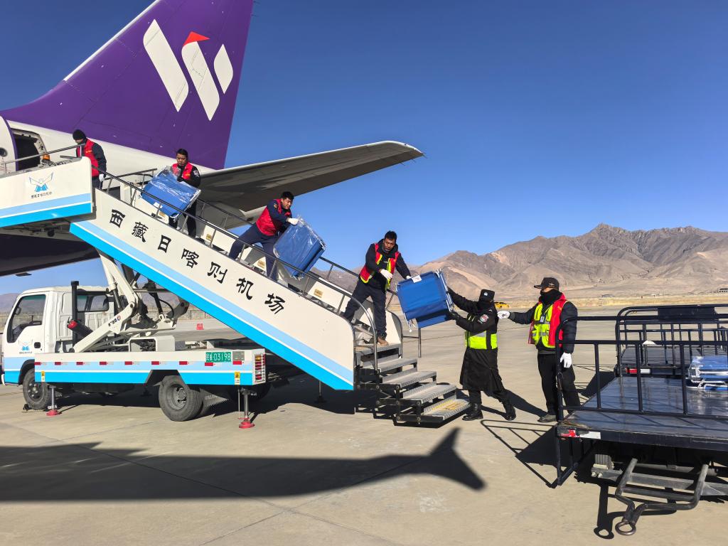 1月9日上午,救援物資抵達西藏日喀則機場。新華社發