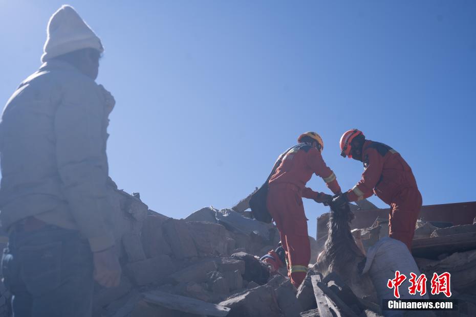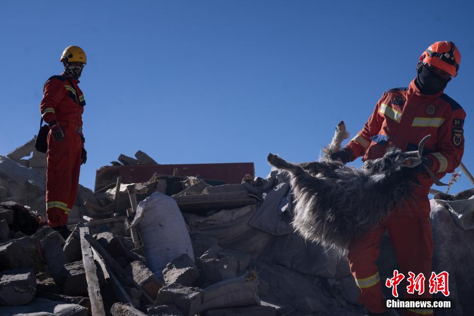 1月8日,西藏自治區日喀則定日縣長所鄉(xiang) 強嘎村,西藏消防救援總隊救援人員為(wei) 民眾(zhong) 找回地震掩埋的羊。1月7日9時5分,西藏自治區日喀則市定日縣發生6.8級地震,震源深度10公裏。中新社記者 貢嘎來鬆 攝