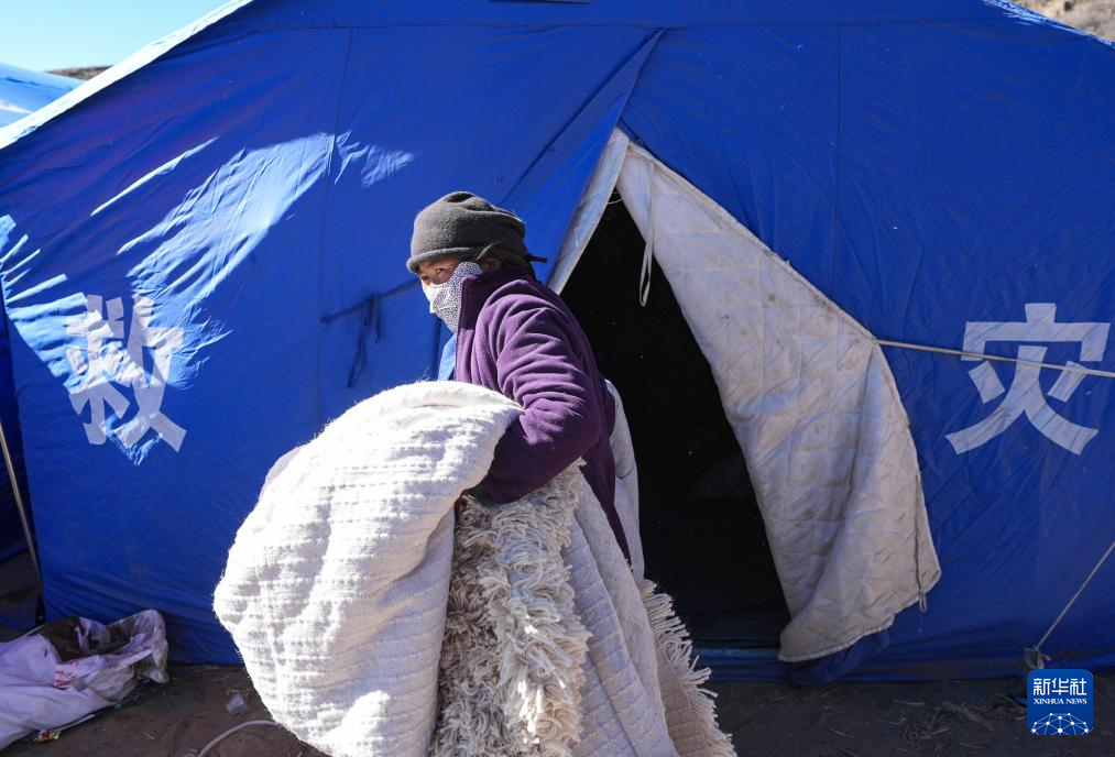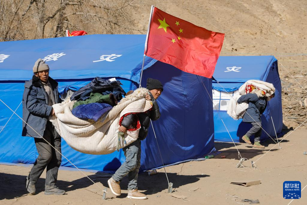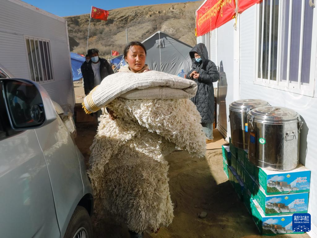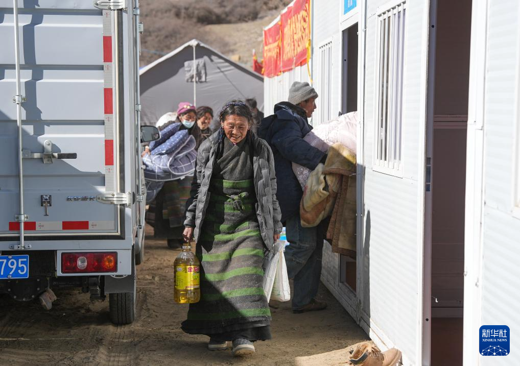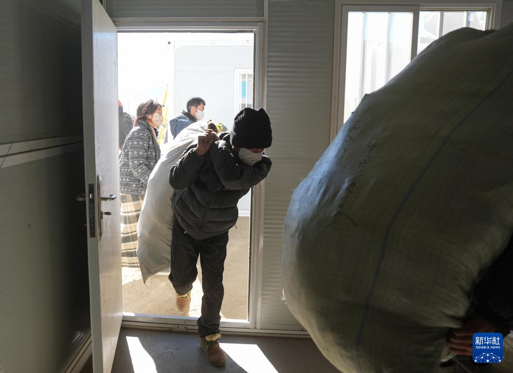 1月10日,在定日縣長所鄉(xiang) 古榮村,受災群眾(zhong) 將領取到的過冬物資搬入板房。新華社記者 沈伯韓 攝