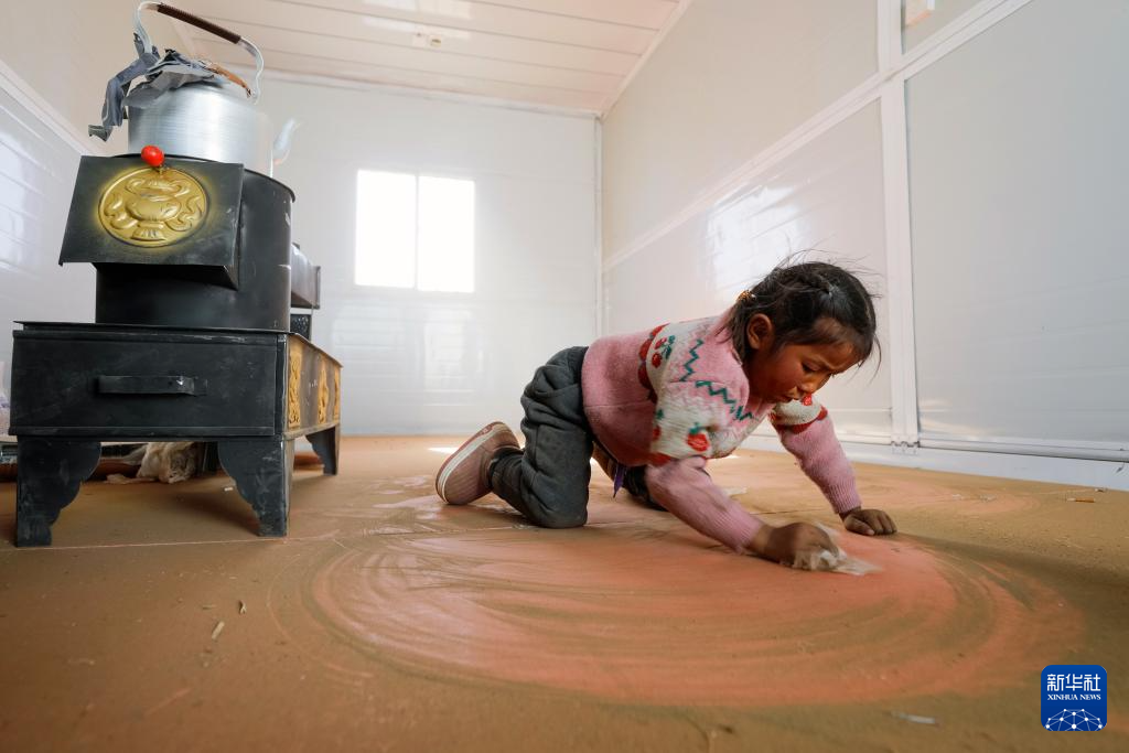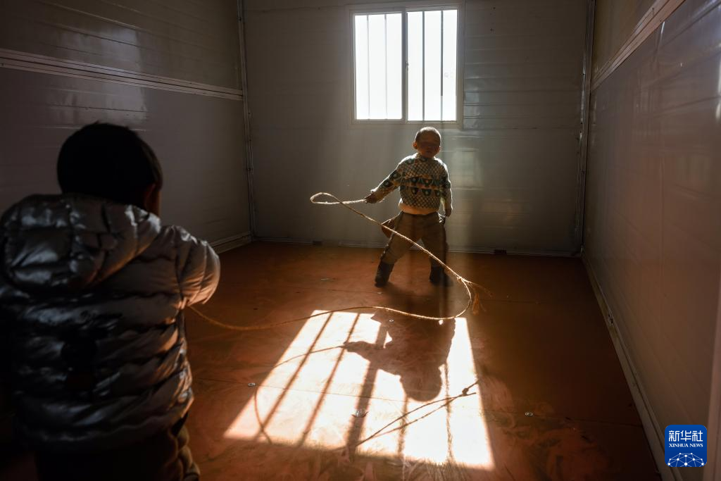 1月10日,在定日縣長所鄉(xiang) 古榮村,兩(liang) 名小朋友在板房內(nei) 玩耍。新華社記者 沈伯韓 攝