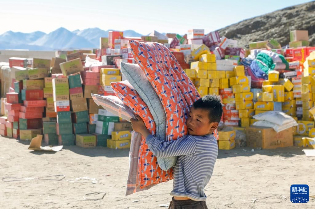 1月10日,在定日縣長所鄉(xiang) 古榮村,一名男孩抱著領取到的過冬物資,從(cong) 臨(lin) 時安置帳篷搬入板房。新華社記者 沈伯韓 攝