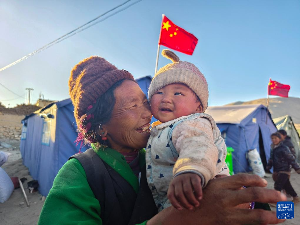 1月10日,在定結縣郭加鄉(xiang) 乃村安置點,一名老人在哄孩子。新華社記者 李華 攝