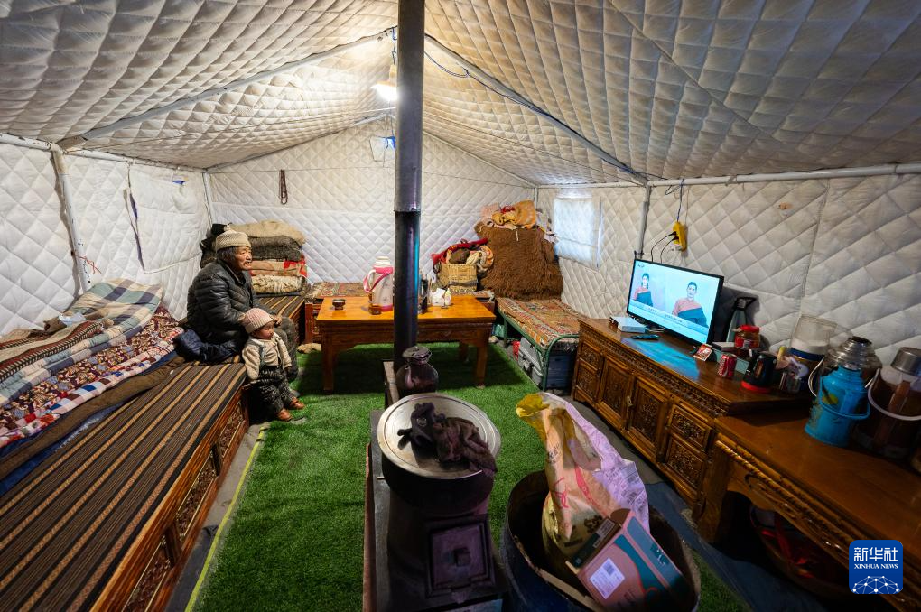1月10日,在定結縣郭加鄉(xiang) 乃村安置點,老人和孩子在救災帳篷裏看電視。新華社記者 丁增尼達 攝