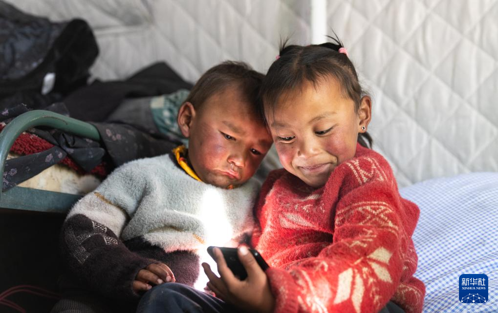 1月10日,在定結縣郭加鄉(xiang) 切村安置點,姐弟倆(lia) 在帳篷裏依偎著玩手機。新華社記者 丁增尼達 攝