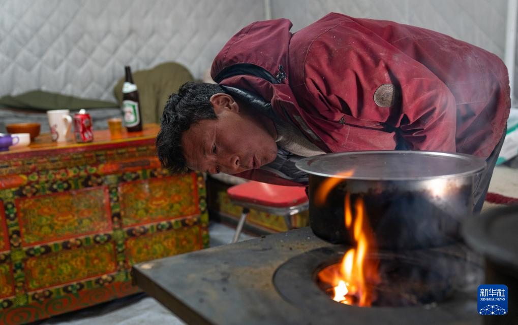 1月10日,在定結縣郭加鄉(xiang) 切村安置點,群眾(zhong) 在救災帳篷裏生火。新華社記者 丁增尼達 攝