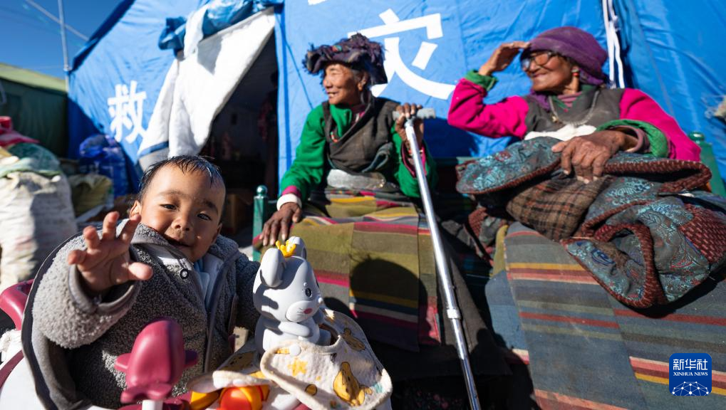 1月10日,在定結縣郭加鄉(xiang) 切村安置點,老人和孩子在救災帳篷前休息、曬太陽。新華社記者 丁增尼達 攝