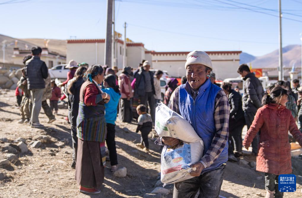 1月10日,在定結縣郭加鄉(xiang) 切村安置點,領到大米的老人露出笑容。新華社記者 丁增尼達 攝