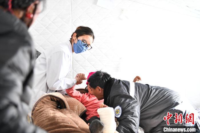 1月10日,西藏定日,醫護人員帶老人達娃的孫女去複查。 中新社記者 貢嘎來鬆 攝