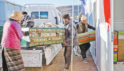 1月11日,西藏定日縣曲洛鄉(xiang) 措昂村,首批入住活動板房的村民正在搬運物品,為(wei) 入住做準備。記者 張武軍(jun) 攝
