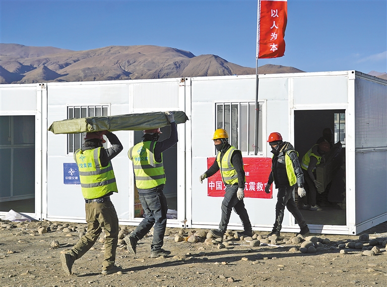 圖為(wei) 1月10日,中交集團二航局二公司工作人員在拉孜縣為(wei) 受災群眾(zhong) 組裝活動板房。記者 薛瑩 王香香 索朗群培 攝