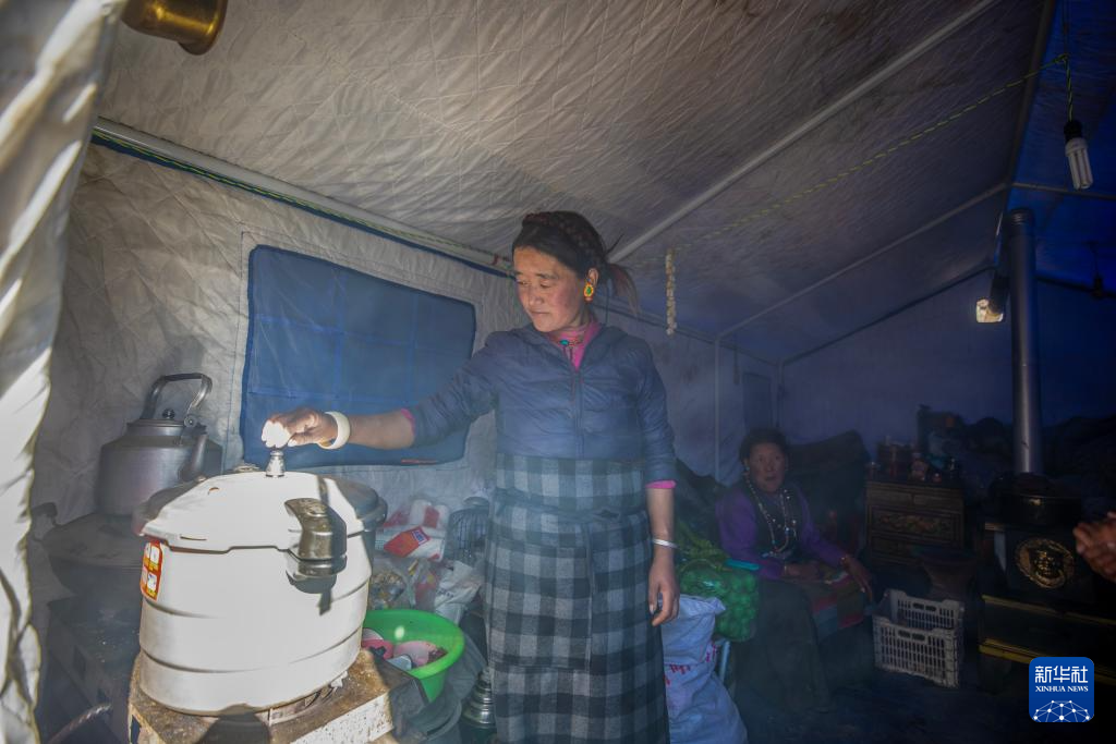 1月11日,受災群眾(zhong) 次仁措姆在普村安置點的帳篷裏做飯。新華社記者 薑帆 攝