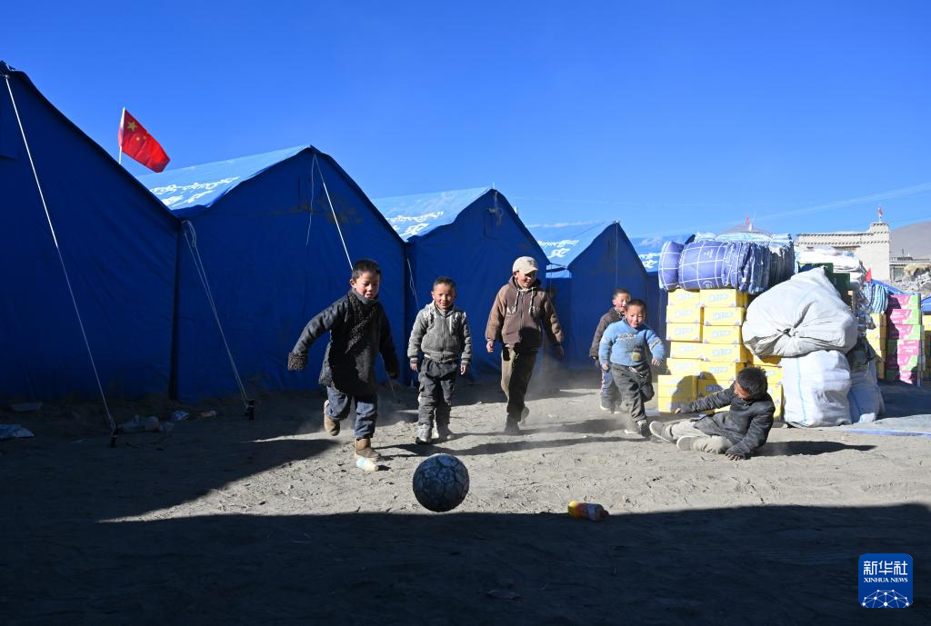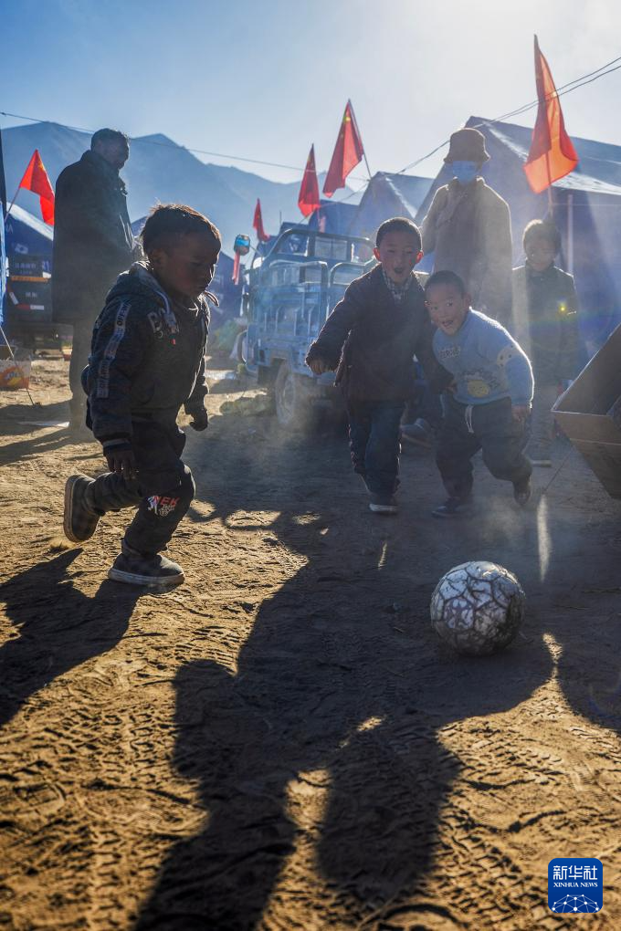 1月11日,小朋友在普村安置點踢球。新華社記者 李響 攝