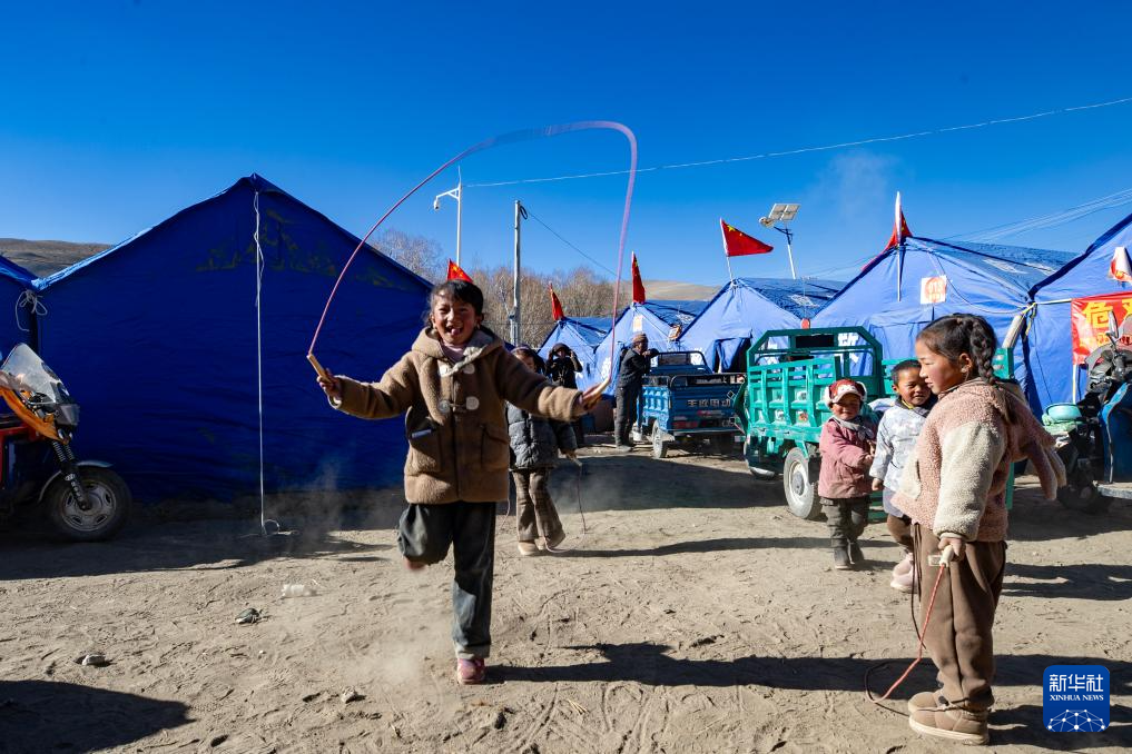 1月11日,小朋友在普村安置點跳繩。新華社記者 薑帆 攝
