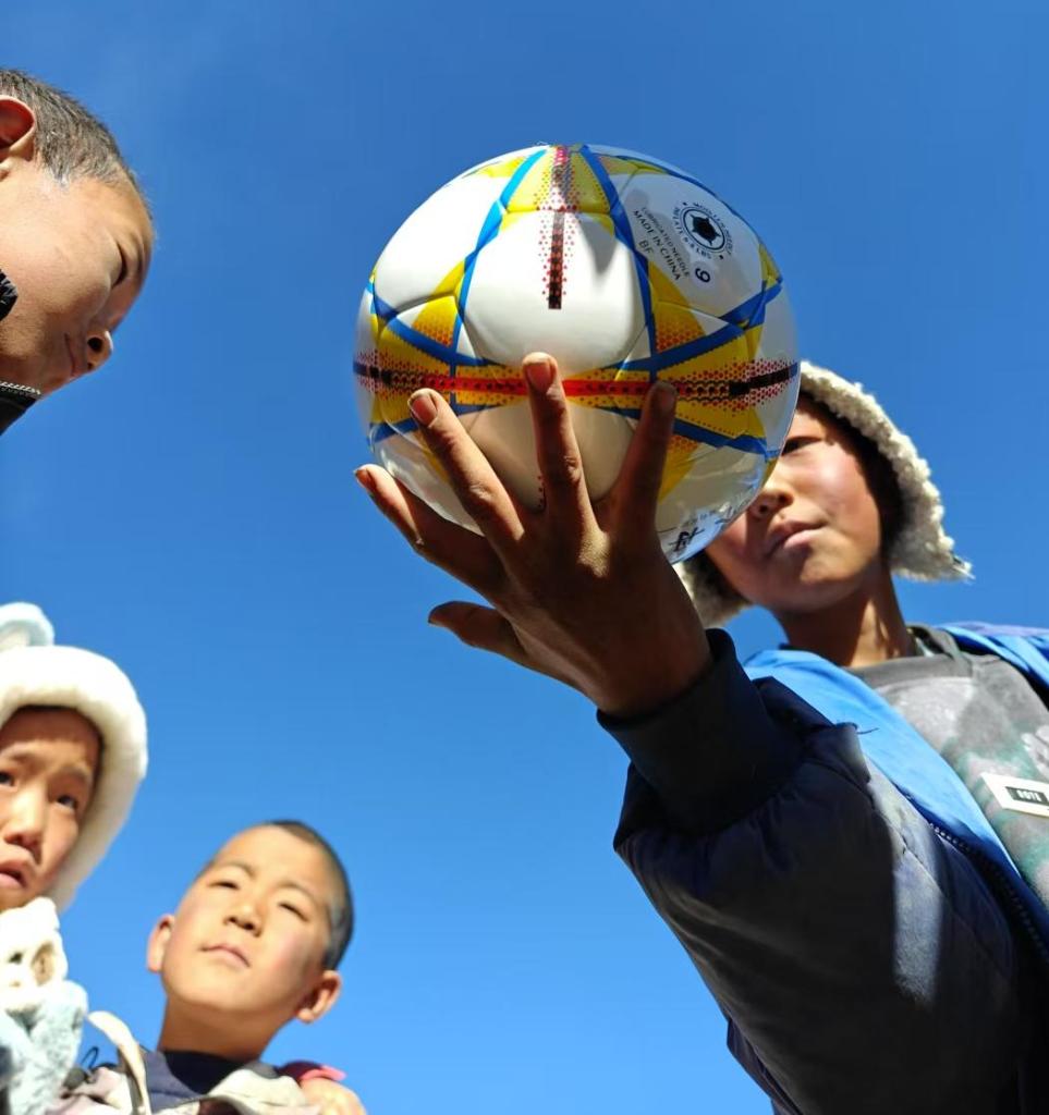 男孩子們(men) 喜歡踢球,譚惜仁給他們(men) 找來足球,兩(liang) 個(ge) 土塊一擺就是球門,開踢。他們(men) 給自己起了個(ge) 響亮的名字——“犛牛隊”!