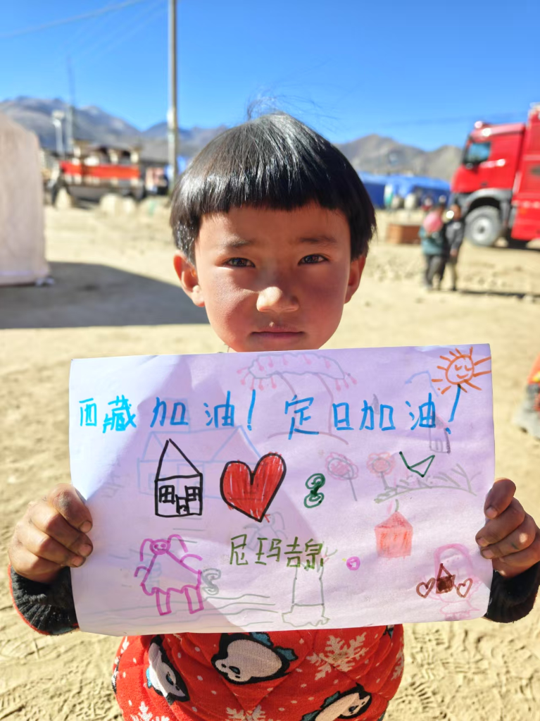 6歲的尼瑪吉宗穿著花棉襖,先畫了一頂小小的帳篷,在旁邊畫上了大大的紅心,把梳著羊角辮的自己也畫上去,天空畫上了太陽。她想了想,工工整整地寫(xie) 上:“西藏加油!”“定日加油!”