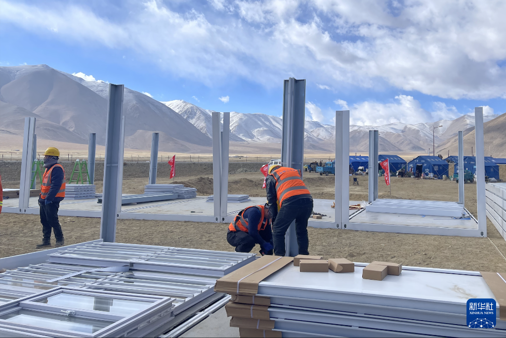 1月13日上午,中鐵二十局工作人員在定日縣措果鄉(xiang) 雪珠村安置點搭建活動板房。新華社記者蔣夢辰 攝