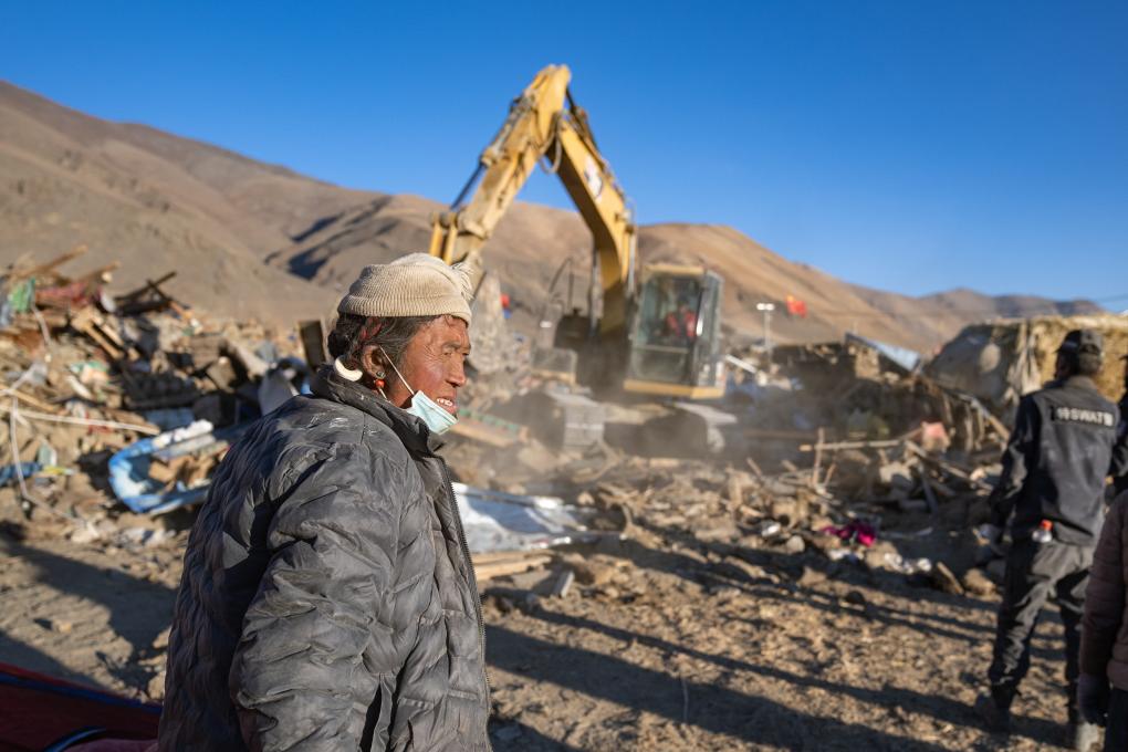 1月13日,在定日縣長所鄉(xiang) 古榮村,次仁紮西老人站在自家的廢墟前。新華社記者丁增尼達 攝