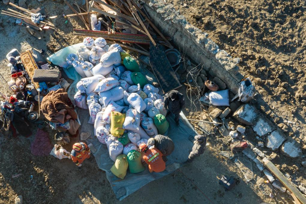 1月13日,在定日縣長所鄉(xiang) 古榮村,消防員們(men) 在整理從(cong) 廢墟中搶救出的青稞(無人機照片)。新華社記者丁增尼達 攝
