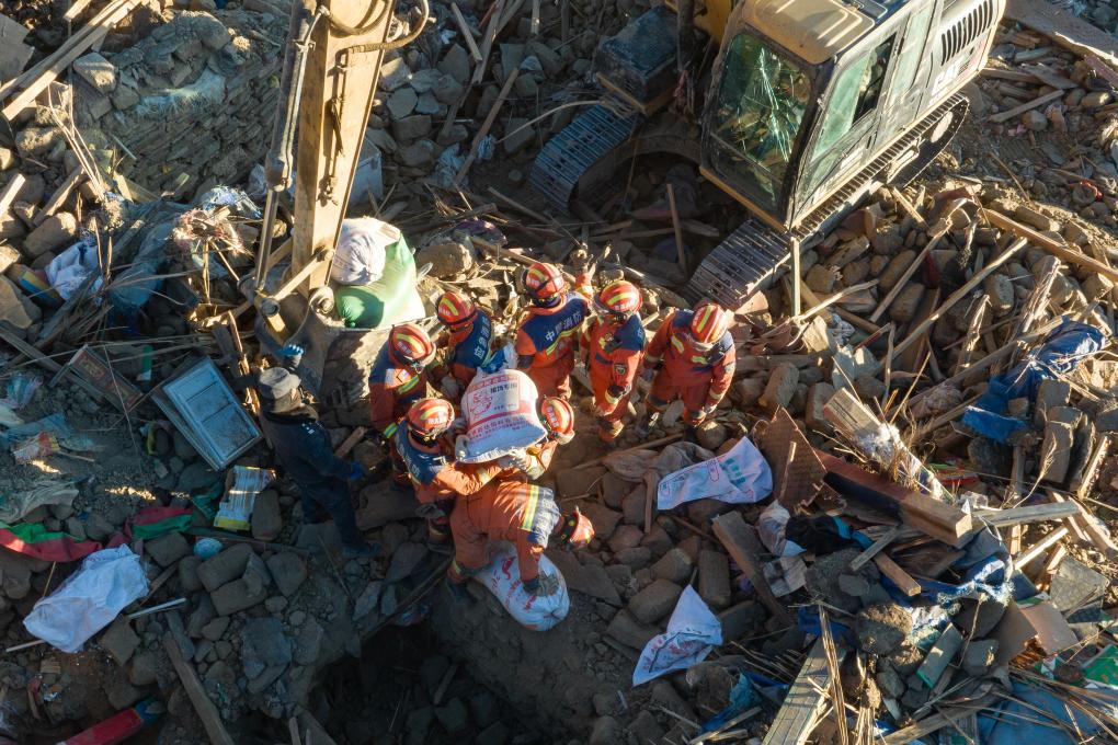 1月13日,在定日縣長所鄉(xiang) 古榮村,消防員們(men) 在搬運從(cong) 廢墟中搶救出的青稞(無人機照片)。新華社記者丁增尼達 攝