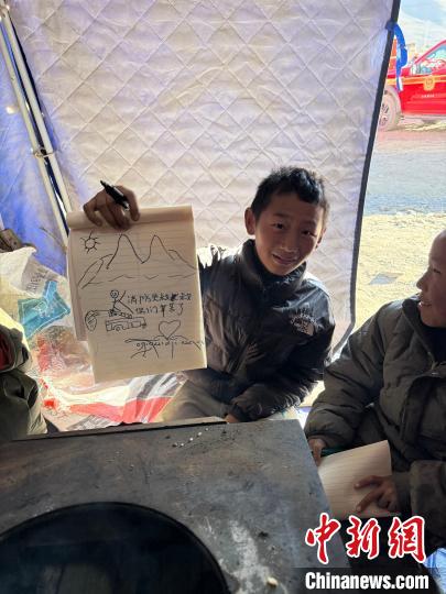 多吉擔心地震給孩子們(men) 帶來心理陰影,為(wei) 了讓他們(men) 樂(le) 觀度過這段時間,多吉整理了單位用來存放物資的帳篷作為(wei) 畫畫的地方,又特意托加油站工作人員為(wei) 孩子們(men) 購買(mai) 了彩筆和畫本。