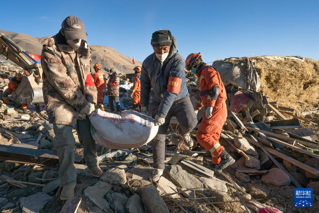 1月13日,在定日縣長所鄉(xiang) 古榮村,消防員們(men) 在搬運從(cong) 次仁紮西老人家裏搶救出的青稞。新華社記者 丁增尼達 攝